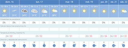 Dit blijkt uit de meest recente weersvoorspellingen van de meteorologen. Woensdag 19 juli lijkt daarbij in de huidige verwachtingen de warmste dag te worden met een gemiddelde dagtemperatuur van 36 graden Celsius, daarna neemt de hitte weer iets af met gemiddelde dagtemperaturen van 30 graden Celsius. Van kans op regen is volgens Aemet geen sprake, ook de wind laat het tot vrijdag 21 juli afweten.
