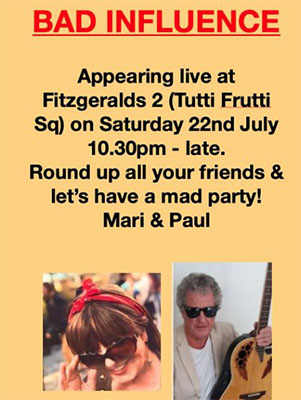 NERJA – Het gelegenheidsduo Bad Influence treedt zaterdagavond 22 juli op bij bar Fitzgeralds II aan de Calle Antonio Millón 2 in het centrum van Nerja.