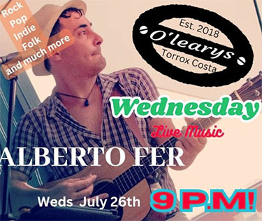 TORROX – Bij O’Leary’s Irish Bar, aan de aan de Paseo Marítimo de Ferrara in Torrox-Costa, speelt woensdagavond 26 juli de Spaanse gitarist Alberto Fer.
