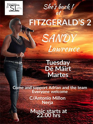 Optreden zangeres Sandy Lawrence bij Fitzgerald’s Bar II NERJA – De zangeres Sandy Lawrence treedt dinsdagavond 25 juli op bij Fitzgerald’s Bar II aan de Calle Antonio Millón 2 in het centrum van Nerja. Het optreden begint rond de klok van 22.00 uur, de bar is geopend vanaf 19.00 uur. Delen: Klik om te delen op X (Opent in een nieuw venster) X Klik om te delen op Facebook (Opent in een nieuw venster) Facebook Vind-ik-leuk Aan het laden...
