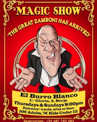 NERJA – Op iedere donderdag- en zondagavond zijn er deze zomer in bar El Burro Blanco in het centrum van Nerja goochelshows te zien van de goochelaar Zamboni. Deze beginnen telkens om circa 20.00 uur.
