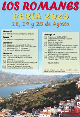 LOS ROMANES – In het Axarquía-dorp Los Romanes staat van donderdag 17 tot en met zondag 20 augustus het jaarlijkse dorpsfeest op het programma. Dit Feria de Los Romanes begint op donderdagavond 17 augustus met een voetbaltoernooi (21.00 uur), het eigenlijke feest barst los op vrijdagavond 18 augustus om 23.00 uur met de muzikale opening van de gemeentelijke feesttent.