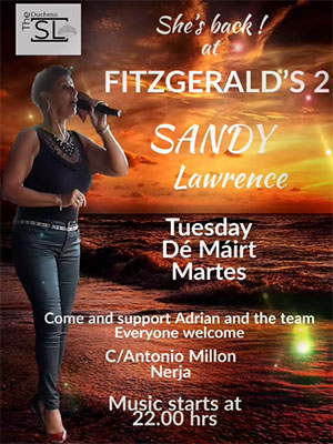 Zangeres Sandy Lawrence bij Fitzgerald’s Bar II in Nerja NERJA – De zangeres Sandy Lawrence treedt dinsdagavond 15 augustus op bij Fitzgerald’s Bar II aan de Calle Antonio Millón 2 in het centrum van Nerja. Het optreden begint rond de klok van 22.00 uur, de bar is geopend vanaf 19.00 uur. Delen: Klik om te delen op X (Opent in een nieuw venster) X Klik om te delen op Facebook (Opent in een nieuw venster) Facebook Vind-ik-leuk Aan het laden...