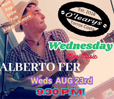 TORROX – Bij O’Leary’s Irish Bar, aan de aan de Paseo Marítimo de Ferrara in Torrox-Costa, speelt woensdagavond 23 augustus de gitarist Alberto Fer.