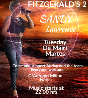 Zangeres Sandy Lawrence treedt op bij Fitzgerald’s Bar II NERJA – De zangeres Sandy Lawrence treedt dinsdagavond 22 augustus op bij Fitzgerald’s Bar II aan de Calle Antonio Millón 2 in het centrum van Nerja. Het optreden begint rond de klok van 22.00 uur, de bar is geopend vanaf 19.00 uur. Delen: Klik om te delen op X (Opent in een nieuw venster) X Klik om te delen op Facebook (Opent in een nieuw venster) Facebook Vind-ik-leuk Aan het laden...