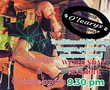 TORROX – De Ierse zanger en gitarist Cíarán Ó´Cuínneagáin verzorgt woensdagavond 30 augustus een akoestisch optreden in de kustplaats Torrox, op circa tien kilometer van Nerja gelegen. Dit gebeurt op het terras van O’Leary’s Irish Bar aan de Paseo Marítimo de Ferrara.