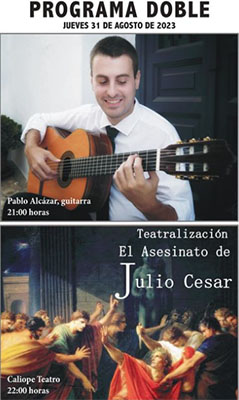 NERJA – De jaarlijkse reeks aan evenementen op het Plaza de Fábrica de los Cangrejos in Nerja krijgt donderdagavond 31 augustus een vervolg met een dubbelprogramma. Allereerst is er om 21.00 uur een optreden van de gitarist Pablo Alcázar, om 22.00 uur gevolgd door een opvoering van het theaterstuk ´El Asesinato de Julio Caesar´ door Caliope Teatro.