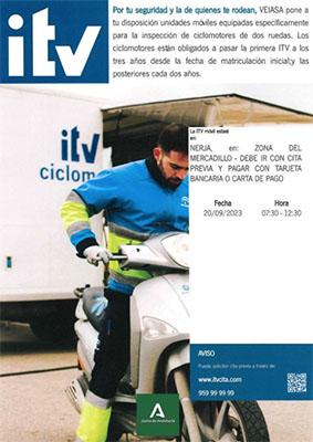 NERJA – Het mobiele keuringsstation ‘ITV de Ciclomotores’ doet op woensdag 20 september Nerja weer aan, om bromfietsbezitters in en rond Nerja de gelegenheid te geven hun tweewielers aan te bieden voor de (verplichte) tweejaarlijkse ITV-keuring.