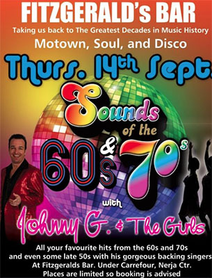 NERJA – De artiest Johnny G treedt donderdagavond 14 september op bij Fitzgerald’s Bar I, op de hoek van park Verano Azul onder het pand van de Carrefour-supermarkt in Nerja.