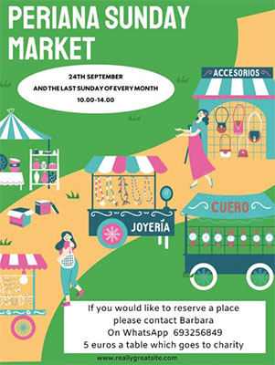PERIANA – Voor de marktliefhebbers die aanstaande zondag tevergeefs zoeken naar de rommelmarkt in Nerja (tot nader order uitgesteld wegens onenigheden tussen de gemeente Nerja en de organiserende Lions Club) biedt het bergdorp Periana een alternatief. Daar wordt zondag 24 september (én elke laatste zondag van de komende maanden) een markt gehouden.