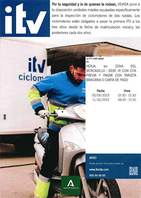 NERJA – Het mobiele keuringsstation ‘ITV de Ciclomotores’ doet op woensdag 11 oktober Nerja weer aan, om bromfietsbezitters in en rond Nerja de gelegenheid te geven hun tweewielers aan te bieden voor de (verplichte) tweejaarlijkse ITV-keuring.