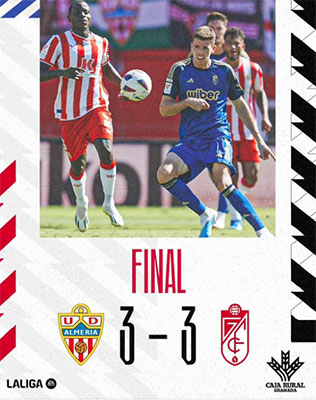 ALMERIA – In een streekderby tussen de twee nummers laatst in de Spaanse Primera División heeft de Andalusische voetbalclub Granada CF zondagmiddag 1 oktober een zwaar bevochten punt uit het vuur gesleept: 3-3 tegen UD Almería.