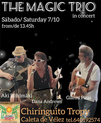 CALETA DE VELEZ – In de kustplaats Caleta de Vélez treedt zaterdagmiddag 7 oktober de band The Magic Trio op. Dit gebeurt bij Chiringuito Tropy, vlakbij de jachthaven van Vélez-Málaga, Puerto Caleta de Vélez.