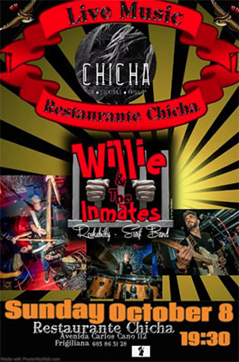 FRIGILIANA – De band Willie & The Inmates treedt zondagavond 8 oktober op bij restaurant Chicha aan het Plaza de las Tres Culturas in Frigiliana. De band brengt voornamelijk rock’n’roll- en rockabillymuziek ten gehore.