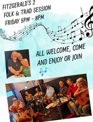 Opgetreden wordt daarbij door diverse artiesten vanaf de klok van 17.00 uur tot circa 20.00 uur. Deze Folk & Trad Session wordt in de wintermaanden wekelijks op vrijdag herhaald.