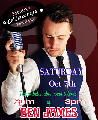 TORROX – De Britse zanger/gitarist Ben James treedt zaterdagmiddag 7 oktober op bij O’Leary’s Irish Bar in de kustplaats Torrox. Het optreden begint rond de klok van 15.00 uur.