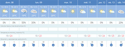 Voor de rest van de week lijkt de regenkans erg klein, terwijl de gemiddelde dagtemperaturen schommelen rond de 24 graden Celsius. Wél is er de gehele week kans op voorbijdrijvende wolkenvelden rond Nerja, de wind neemt met ingang van dinsdag 10 oktober iets in kracht toe.