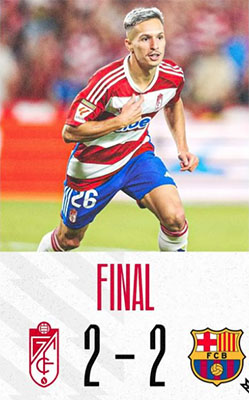 GRANADA – In de Spaanse Primera División stuntte het Andalusische Granada CF zondagavond 8 oktober door topclub FC Barcelona op een 2-2 gelijkspel te houden. De thuisclub overdonderde de voetballers uit Barcelona door al in de eerste minuut te scoren en na een half uur die voorsprong te verdubbelen.
