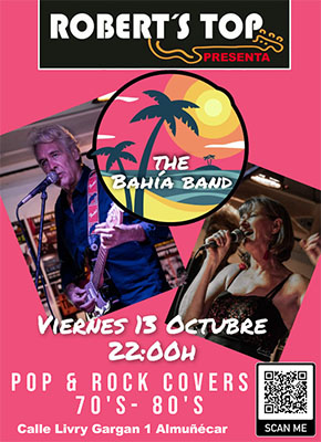 ALMUNECAR – Bij bar/restaurant Robert’s Top in Almuñécar staat vrijdagavond 13 oktober een optreden geprogrammeerd van de Bahía Band. Het optreden begint rond 22.00 uur.