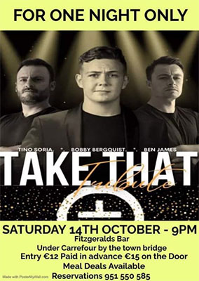 NERJA – De band Take That speelt zaterdagavond 14 oktober bij Fitzgerald’s Bar I in Nerja. De bar is te vinden op de hoek van park Verano Azul (Calle Antonio Ferrandis Chanquete) onder het pand van de Carrefour-supermarkt in Nerja.
