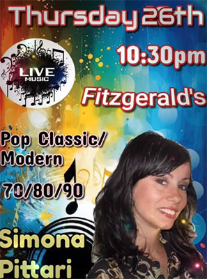 NERJA – De zangeres Simona Pittari treedt donderdagavond 26 oktober op bij Fitzgerald’s Bar, in het centrum van Nerja aan de Calle Antonio Millón 2.