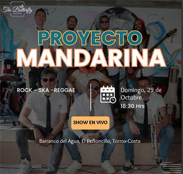TORROX COSTA – Bij de Butterfly Beach Club in de kustplaats Torrox, op zo’n tien kilometer afstand van Nerja, staat zondagavond 29 oktober een optreden gepland van de formatie Proyecto Mandarina.