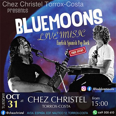 De Belgisch/Nederlandse bar Chez Christel is te vinden in Torrox-Costa aan de Avenida de España (Edif. Nautico 12). Los BlueMoons bestaat uit Juanma Alaminos (zang en gitaar) en toetsenist/zanger Ian Arthur en brengt voornamelijk rock- en popmuziek ten gehore. Het optreden begint om circa 15.00 uur.