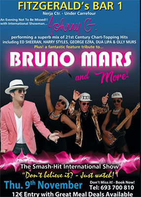 NERJA – De artiest Johnny G treedt donderdagavond 9 november op bij Fitzgerald’s Bar I, op de hoek van park Verano Azul onder het pand van de Carrefour-supermarkt in Nerja.