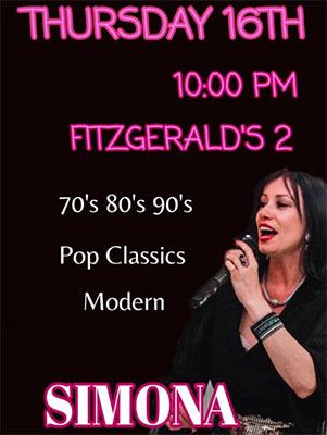 NERJA – De zangeres Simona Pittari treedt donderdagavond 16 november op bij Fitzgerald’s Bar, in het centrum van Nerja aan de Calle Antonio Millón 2.