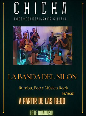 FRIGILIANA – De formatie La Banda del Nilon treedt zondagavond 19 november op bij restaurant Chicha aan het Plaza de las Tres Culturas in Frigiliana. De formatie brengt voornamelijk rumba-, pop- en rockmuziek ten gehore.