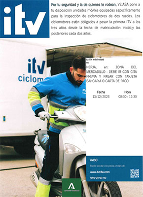 NERJA – Het mobiele keuringsstation ‘ITV de Ciclomotores’ doet op woensdag 13 december Nerja weer aan, om bromfietsbezitters in en rond Nerja de gelegenheid te geven hun tweewielers aan te bieden voor de (verplichte) tweejaarlijkse ITV-keuring.