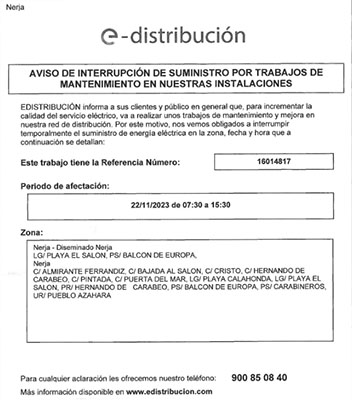 NERJA – Als gevolg van onderhoudswerkzaamheden en vernieuwingen aan het elektriciteitsnetwerk van Nerja kan er op woensdag 22 november sprake zijn van stroomonderbrekingen in het centrum van de stad.
