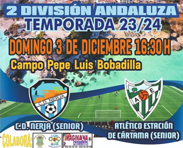 NERJA – Voetbalclub CD Nerja speelt zondagmiddag 3 december een competitiewedstrijd in de 2e División Andaluza tegen Atlético Estación de Cartama in het voetbalstadion Pepe Luis Bobadilla van Nerja. Het aanvangstijdstip van de wedstrijd staat gepland om 16.30 uur.