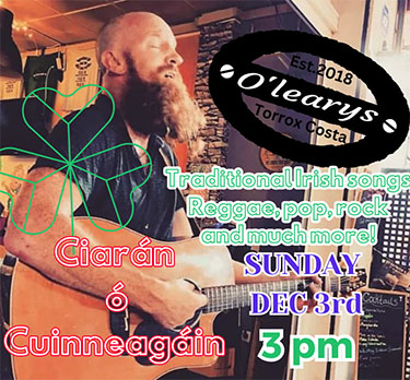 TORROX – De Ierse zanger en gitarist Cíarán Ó´Cuínneagáin treedt zondagmiddag 3 december op bij O’Leary´s Irish Bar aan de Paseo Maritímo de Ferrara in Torrox.
