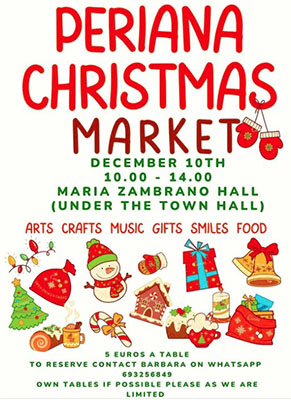 PERIANA – In het bergdorp Periana, achter het Meer van Viñuela een kleine 25 kilometer landinwaarts vanaf Vélez-Málaga gelegen, red.) wordt zondag 10 december een kerstmarkt gehouden. Deze vindt plaats in de Maria Zambrano Hal.