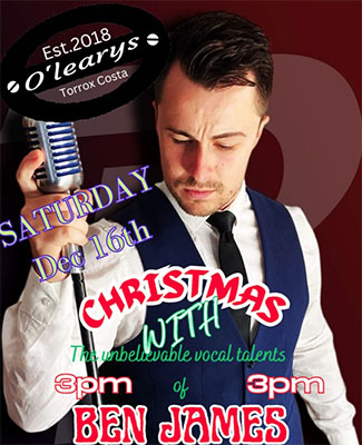 TORROX – De Britse zanger/gitarist Ben James treedt zaterdagmiddag 16 december op bij O’Leary’s Irish Bar in de kustplaats Torrox. Het optreden begint rond de klok van 15.00 uur.