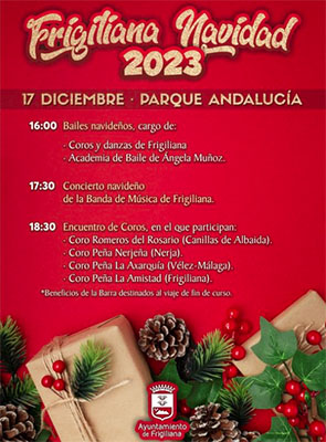 De middag begint om 16.00 uur met een optreden van Coros y Danzas Frigiliana, omlijst door een optreden van leerlingen aan de dansschool Ángela Muñoz. Om 17.30 uur is er het jaarlijkse kerstconcert van de Band de Música de Frigiliana, om 18.30 uur gevolgd door een zogeheten ´Encuentro de Coros´ met medewerking van het Coro Romeros del Rosario (Canillas de Albaida), het Coro Peña Nerjeña, het Coro Peña La Axarquía (Vélez-Málaga) en het Coro Peña la Amistad uit Frigiliana.