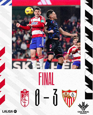 GRANADA – In de laatste en door-de-weekse competitieronde van dit kalenderjaar voor de hoogste Spaanse voetbalafdeling, La Liga, heeft FC Sevilla korte metten gemaakt met de aspiraties van het Andalusische Granada CF. In het stadion Nuevo Los Cármenes van Granada wonnen de bezoekers overtuigend met 0-3.