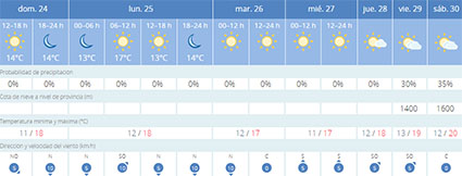 De gemiddelde dag temperaturen liggen daarbij iets onder de 20 graden Celsius met véél zon. Wel komt er naar verwachting af en toe een wolkendek voorbij drijven, de kans dat daaruit regen valt sluit Aemet de komende week uit. Ook de wind laat het voorlopig afweten.
