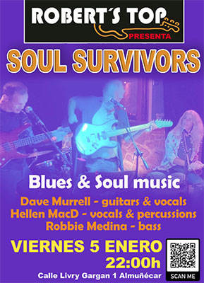 ALMUNECAR – Bij bar/restaurant Robert’s Top in Almuñécar staat vrijdagavond 5 januari een optreden geprogrammeerd van de band Soul Survivors. Het optreden begint rond 22.00 uur.