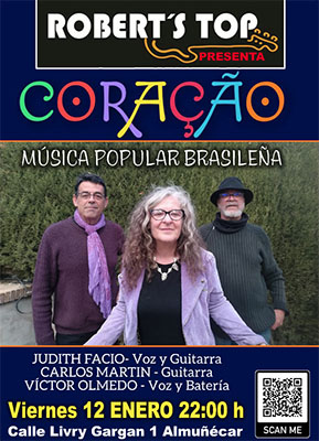 ALMUNECAR – Bij bar/restaurant Robert’s Top in Almuñécar staat vrijdagvond 12 januari een optreden geprogrammeerd van de Braziliaanse formatie Coração. Het optreden begint rond 22.00 uur.