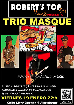 ALMUNECAR – Bij bar/restaurant Robert’s Top in Almuñécar staat vrijdagavond 19 januari een optreden geprogrammeerd van het Trio Masque. Het optreden begint rond 22.00 uur en duurt tot even na middernacht.