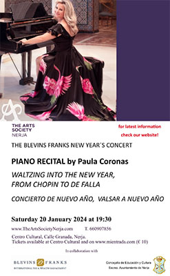 NERJA – In het Centro Cultural Villa de Nerja, aan de Calle Granada 45 in het centrum van de stad, kan zaterdagavond 20 januari een pianorecital van de Spaanse pianiste Paula Coronas worden bijgewoond.