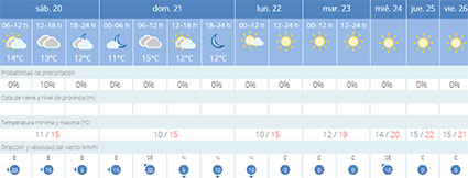 Ook de temperaturen schieten daarbij weer iets omhoog. De komende week stijgen de gemiddelde dagtemperaturen naar waarden boven de 20 graden Celsius, waarbij de kans op neerslag verdwijnt en de wind het (met uitzondering van zondag 21 januari) het grotendeels laat afweten. Dit stelt het weerstation Aemet (Agencia Estatal de Meteorología) in haar meest recente weersvoorspellingen.