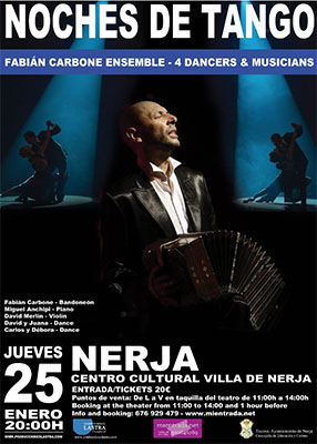 NERJA – De show ´Noches de Tango´ wordt donderdagavond 25 januari door het Fabián Carbone ensemble opgevoerd in het Centro Cultural Villa de Nerja aan de Calle Granada 45, in de binnenstad van Nerja.