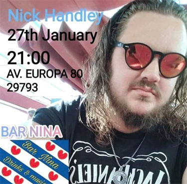 Nick Handley treedt op bij Bar Nina in Torrox TORROX – In de kustplaats Torrox treedt zaterdagavond 27 januari de gitarist Nick Handley op in Bar Nina. De bar is te vinden aan de Avenida Europa, Bloque 80. Het optreden van Handley begint rond de klok van 21.00 uur en is gratis toegankelijk. Delen: Klik om te delen op X (Opent in een nieuw venster) X Klik om te delen op Facebook (Opent in een nieuw venster) Facebook Vind-ik-leuk Aan het laden...