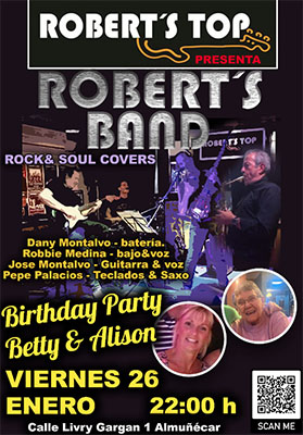 ALMUNECAR – In bar/restaurant Robert’s Top in Almuñécar staat vrijdagavond 26 januari een optreden geprogrammeerd van Robert´s Band. Het optreden begint rond 22.00 uur.