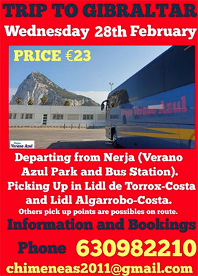 NERJA – Vanuit Nerja is voor woensdag 28 februari door de reisorganisatie Viajes Verano Azul een dagtrip per bus uitgezet naar Gibraltar. De deelnamekosten bedragen 23 euro per persoon, vertrokken wordt er per bus om 07.30 uur vanaf het Parque Verano Azul waarna er ook in Torrox en Algarrobo passagiers worden opgepikt.