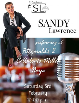 Zangeres Sandy Lawrence treedt op bij Fitzgerald’s Bar II NERJA – De zangeres Sandy Lawrence treedt zaterdagavond 3 februari op bij Fitzgerald’s Bar II aan de Calle Antonio Millón 2 in het centrum van Nerja. Het optreden begint rond de klok van 22.00 uur, de bar is geopend vanaf 19.00 uur. Delen: Klik om te delen op X (Opent in een nieuw venster) X Klik om te delen op Facebook (Opent in een nieuw venster) Facebook Vind-ik-leuk Aan het laden...