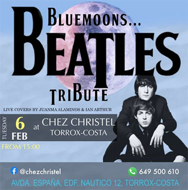 TORROX-COSTA – Bij bar Chez Christel in de kustplaats Torrox, op zo’n tien kilometer afstand van Nerja, staat dinsdagmiddag 6 februari een Beatles-tribute gepland van het duo Juanma Alaminos en Ian Arthur.